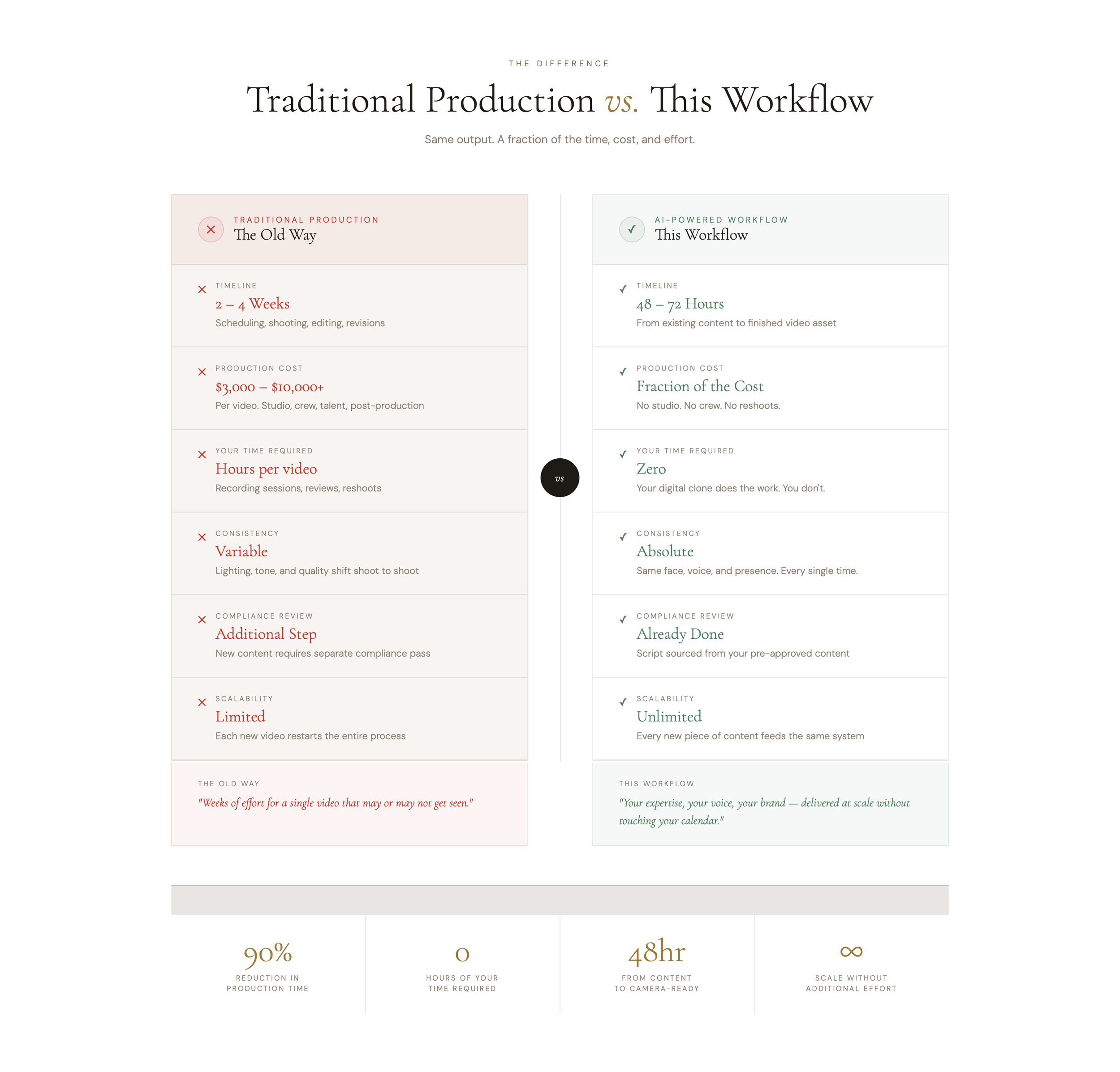 Traditional video production: 2-3 weeks, $3,000-$10,000, requires your time. This workflow: a few hours, fraction of the cost, zero of your time.